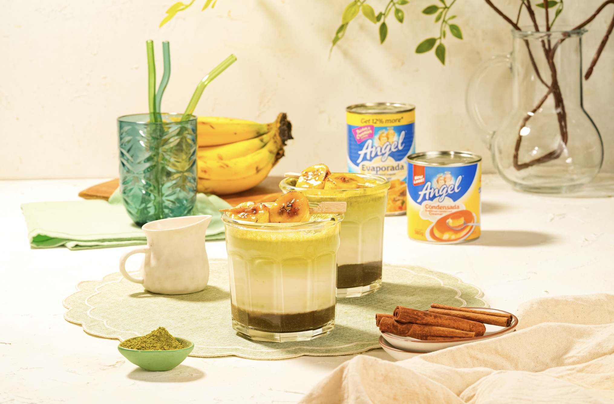 1. In a 16 oz cup, combine the banana bread syrup, Angel Condensed Milk, Angel Evaporated Liquid Creamer, and fresh milk. Stir until well blended.