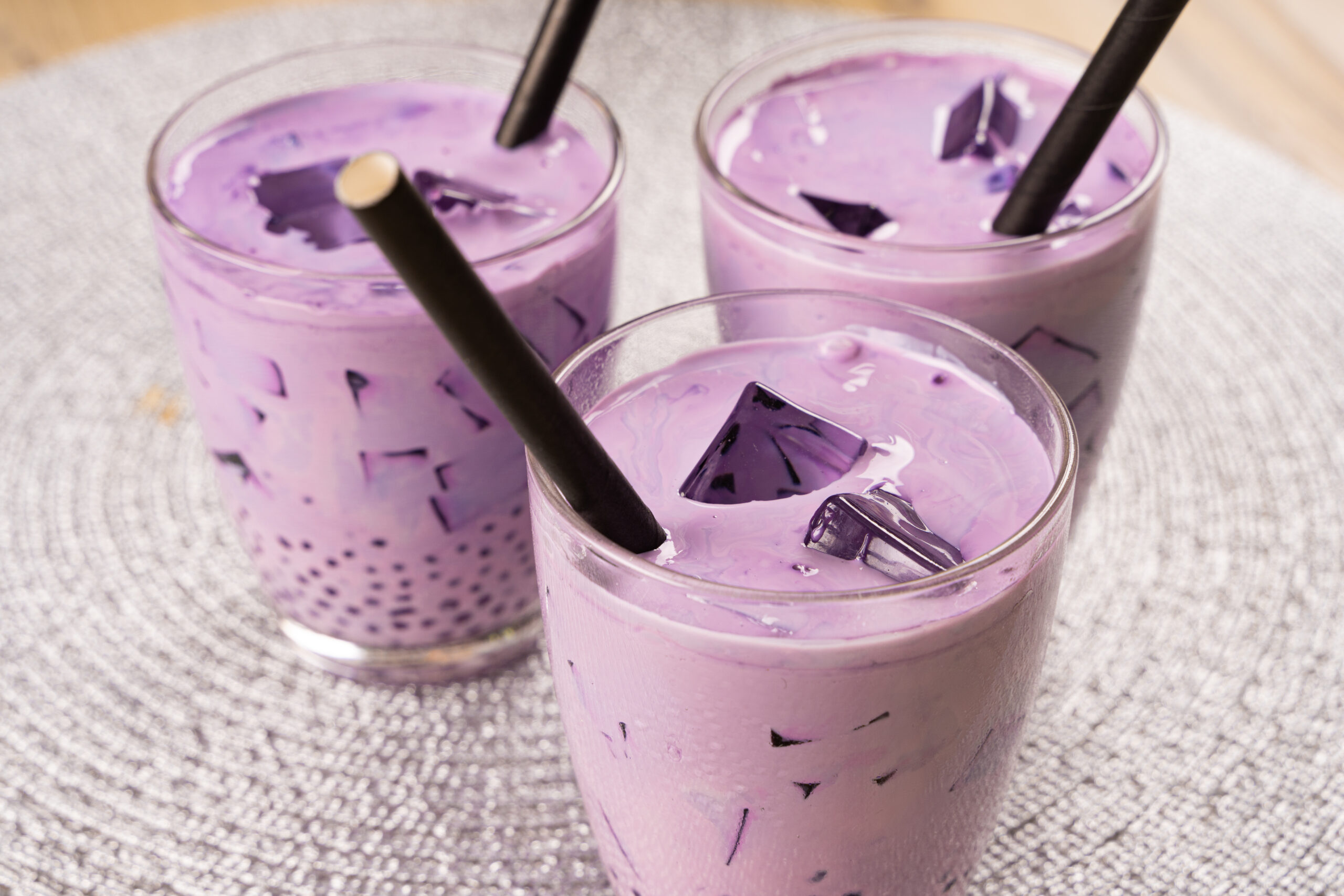 - Pour over glass with filled with ice, top with ube halaya and serve.